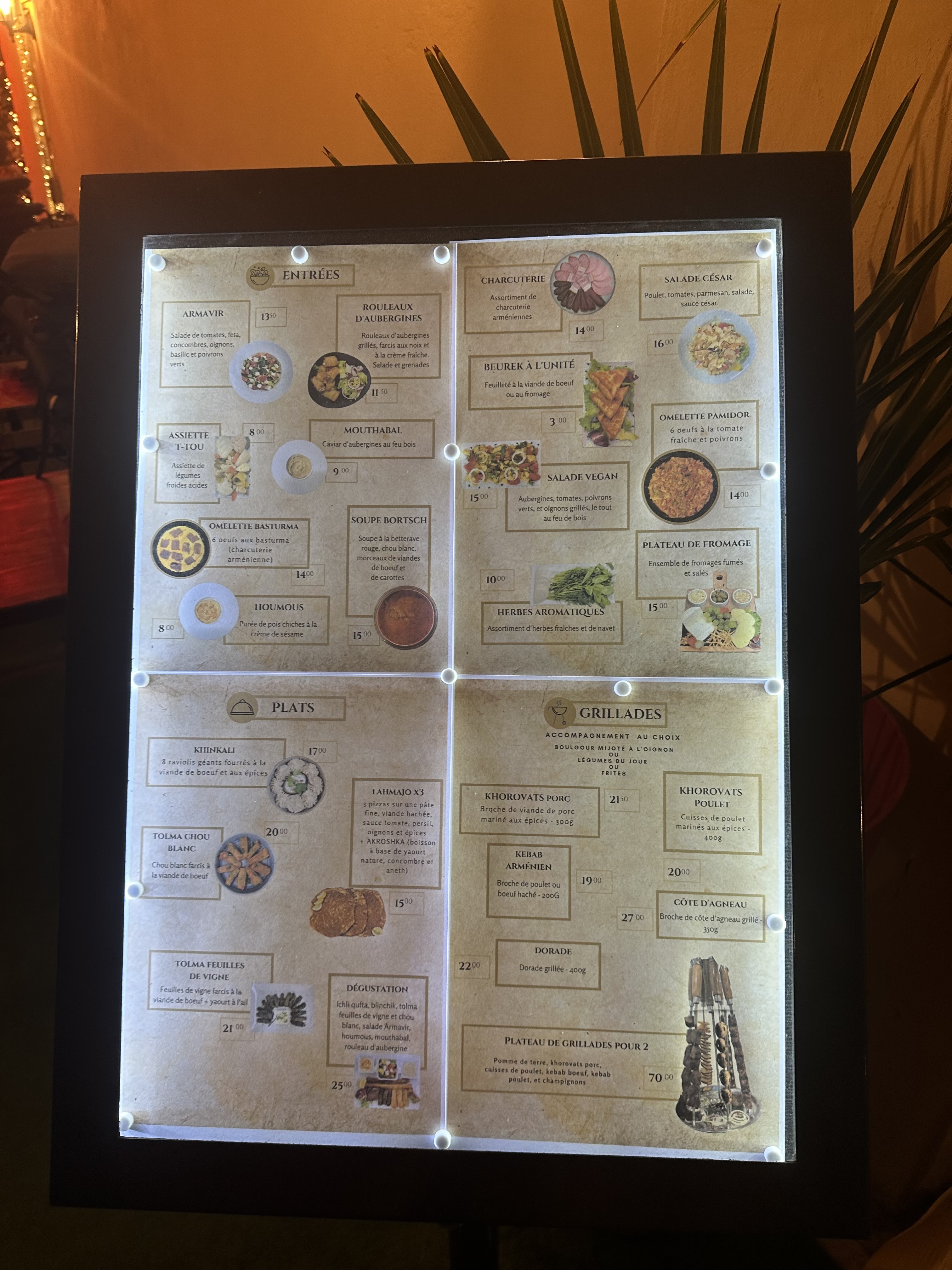 Posté le 12/06/2023 à 10:35"Nous avons été accueillis avec une hospitalité des plus chaleureuses. L'ambiance était un charmant mélange de tradition et d'élégance, avec une atmosphère réconfortante qui semblait être un petit bout d'Arménie ici même dans notre ville. Le menu était un voyage délicieux à travers la cuisine arménienne. Les plats principaux étaient tout aussi impressionnants. Le khorovats (brochettes de viande grillée) était succulent et juteux. Nous y retournerons avec grande joie"