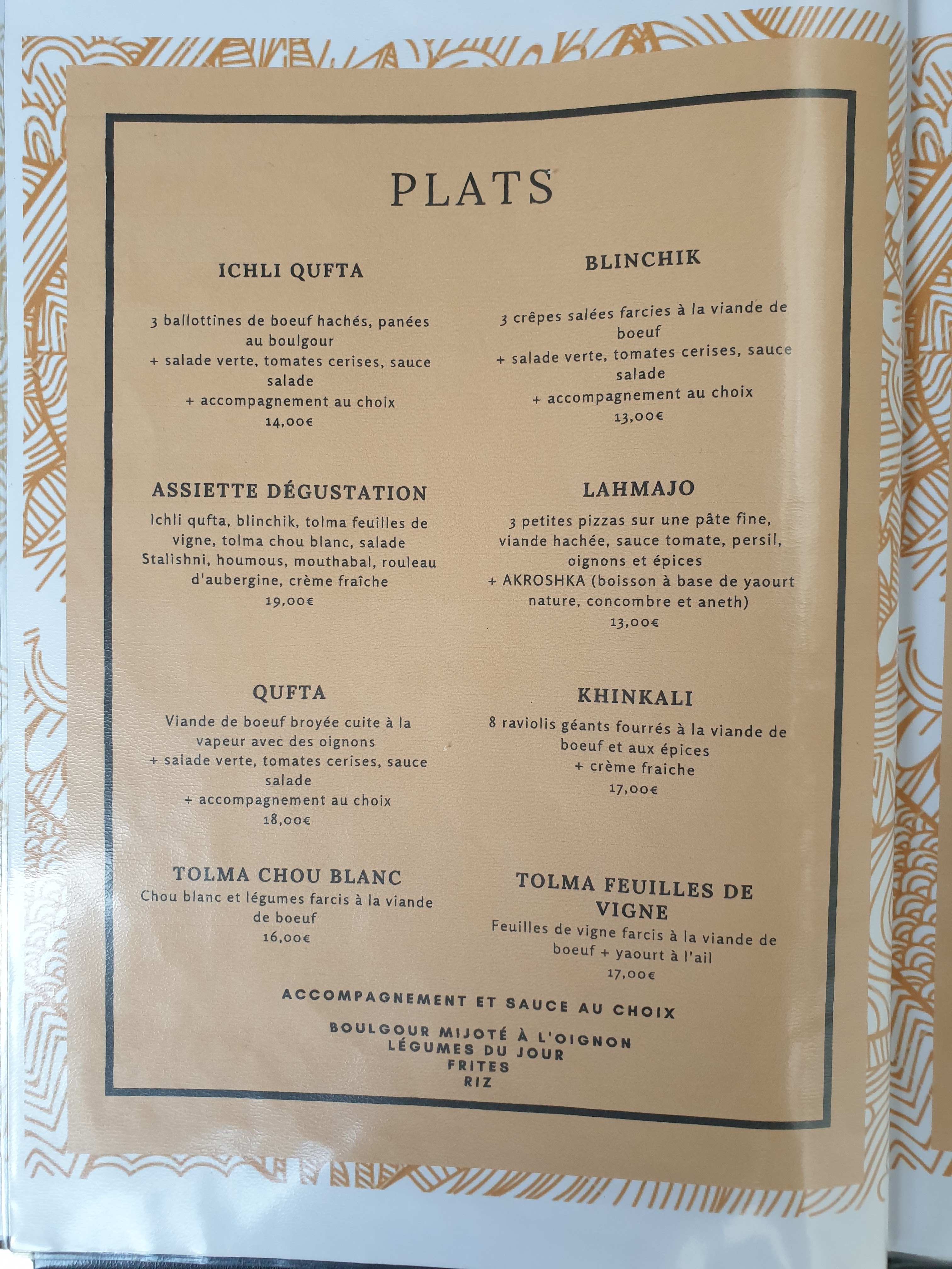 Posté le 04/08/2024 à 09:21"Je n’avais jamais mangé arménien, c’est donc une très belle découverte dans une ambiance chaleureuse et musicale arménienne. Tout le personnel est accueillant, souriant et serviable. Côté cuisine on mélange diverses saveurs orientales et c’est vraiment excellent. Du goût, cuit comme il se doit. Pour ma part j’ai pris l’assiette dégustation qui apporte une partie des différentes spécialités. C’est un excellent compromis à un prix tout à fait raisonnable 27€. Par ces fortes chaleurs, les carafes et glaçons sont apportés à chaque demande. J’y retournerai prochainement avec plaisir pour découvrir d’autres plats."
