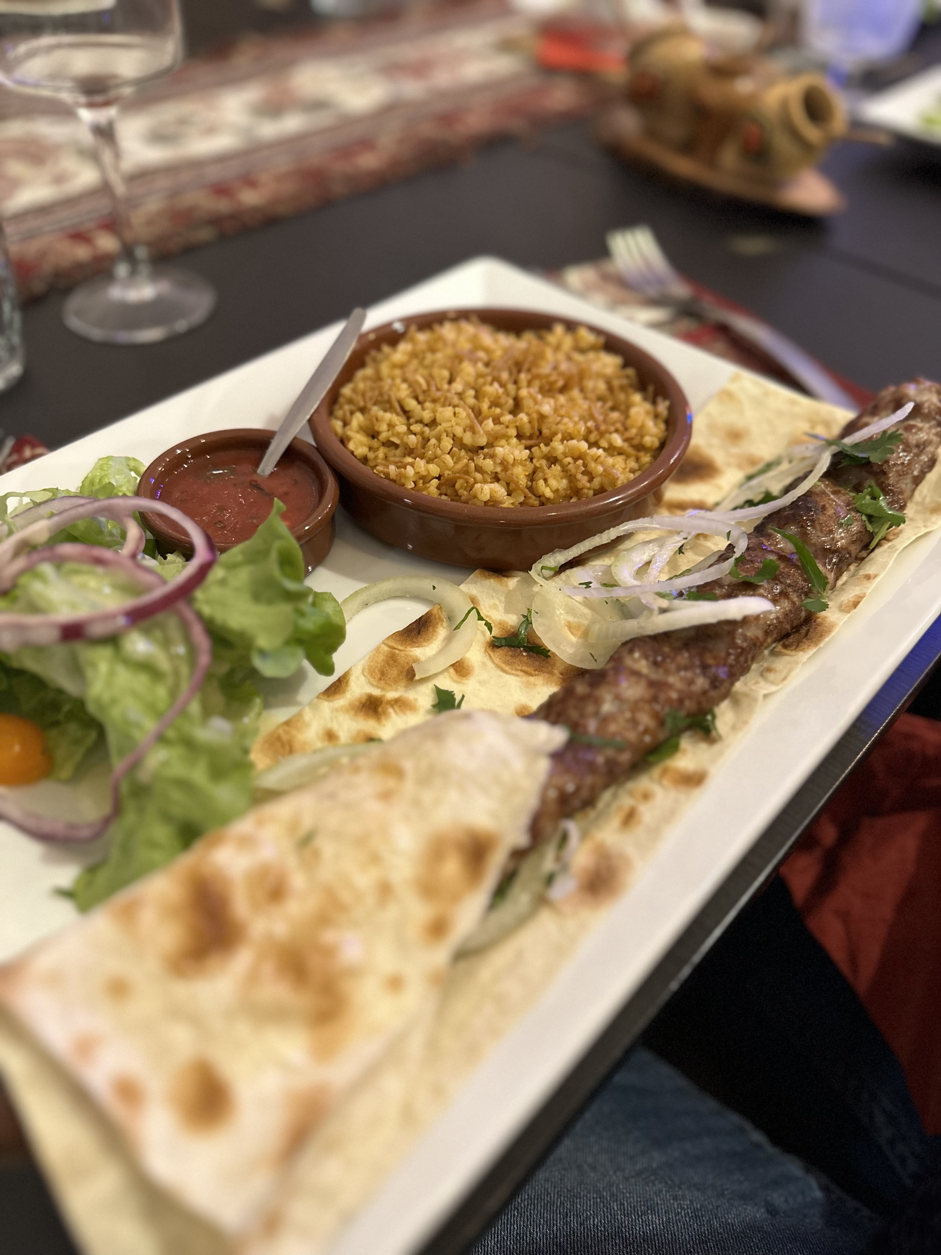 Un peu déçu par le repas, nous avions pris des grillades pour deux, après une entrée composée d'une part de Beurek et d'autre part de rouleaux d'aubergines, ces deux entrées étaient très bonnes, par contre avec les grillades un compagnement légumes ou riz aurait été souhaitable, pour le prix 35€/personne. Attente longue, 40 minutes, on a du demander à 3 serveurs différents pour avoir une carafe d'eau, impossible de s'assoir sur le chaise, le pilier empêche le recul de celle-ci, la musique forte, impossible de s'entendre parler, demande de baisser à 4 reprises, toutes les 20 minutes un serveur augmentait le volume, le prix en particulier pour les grillades trop élevé. Je me suis fié aux avis, mais très loin de ce que j'ai constaté, dommage, un effort aurait pu rendre beaucoup plus agréable ce repas. Je suis venu, j'ai vu, et ne reviendrait pas..