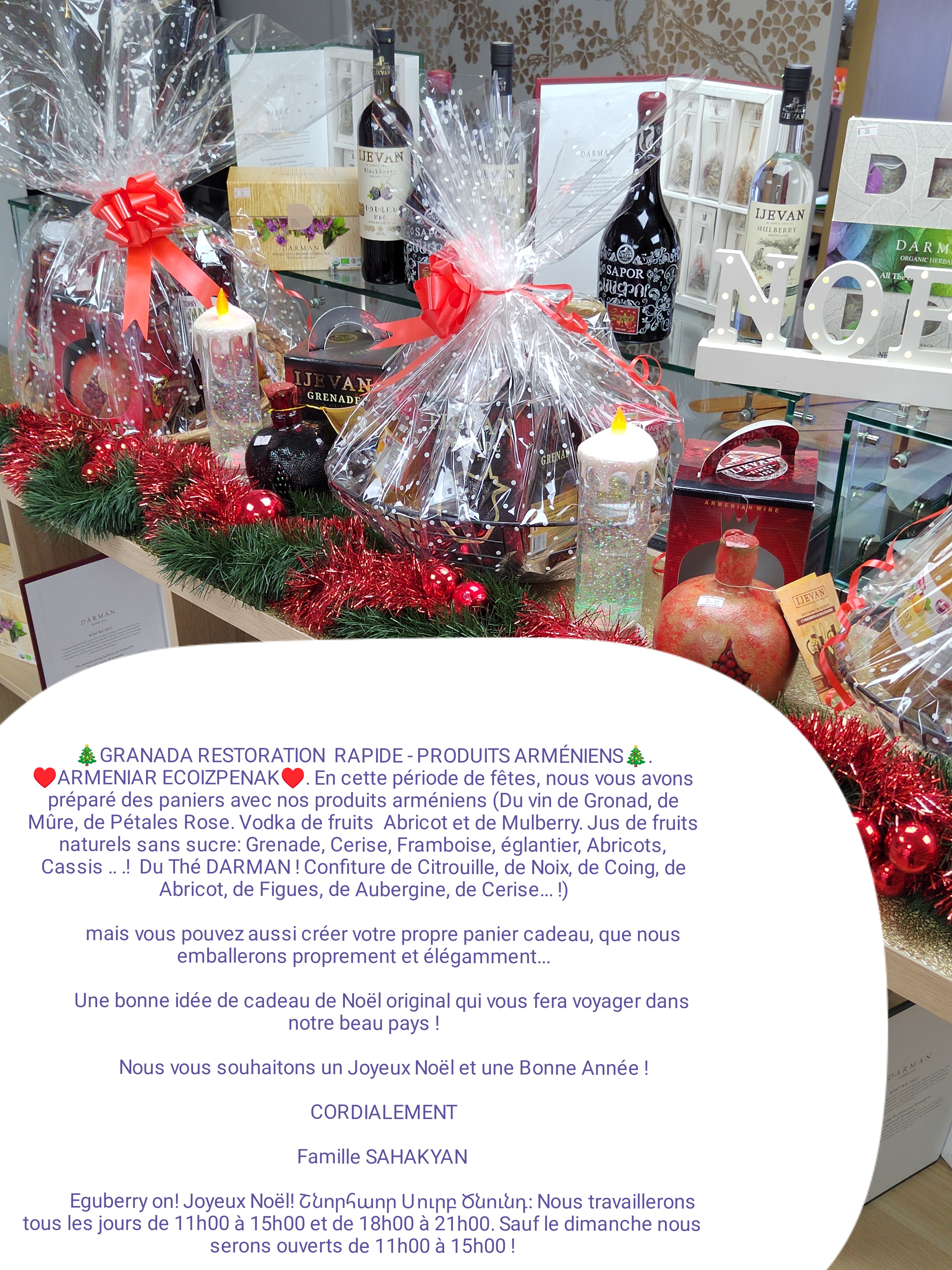 Posté le 14/01/2023 à 19:19"Des gens adorables, des produits d'Arménie à découvrir et des blitts au saumon mais aussi au poulet délicieux. De plus, sur des étagères et frigidaire vous trouverez tout un tas de produits arméniens originaux. Vous pouvez y aller les yeux fermés, vous ne serez pas déçus. Spasiba bolchoï."