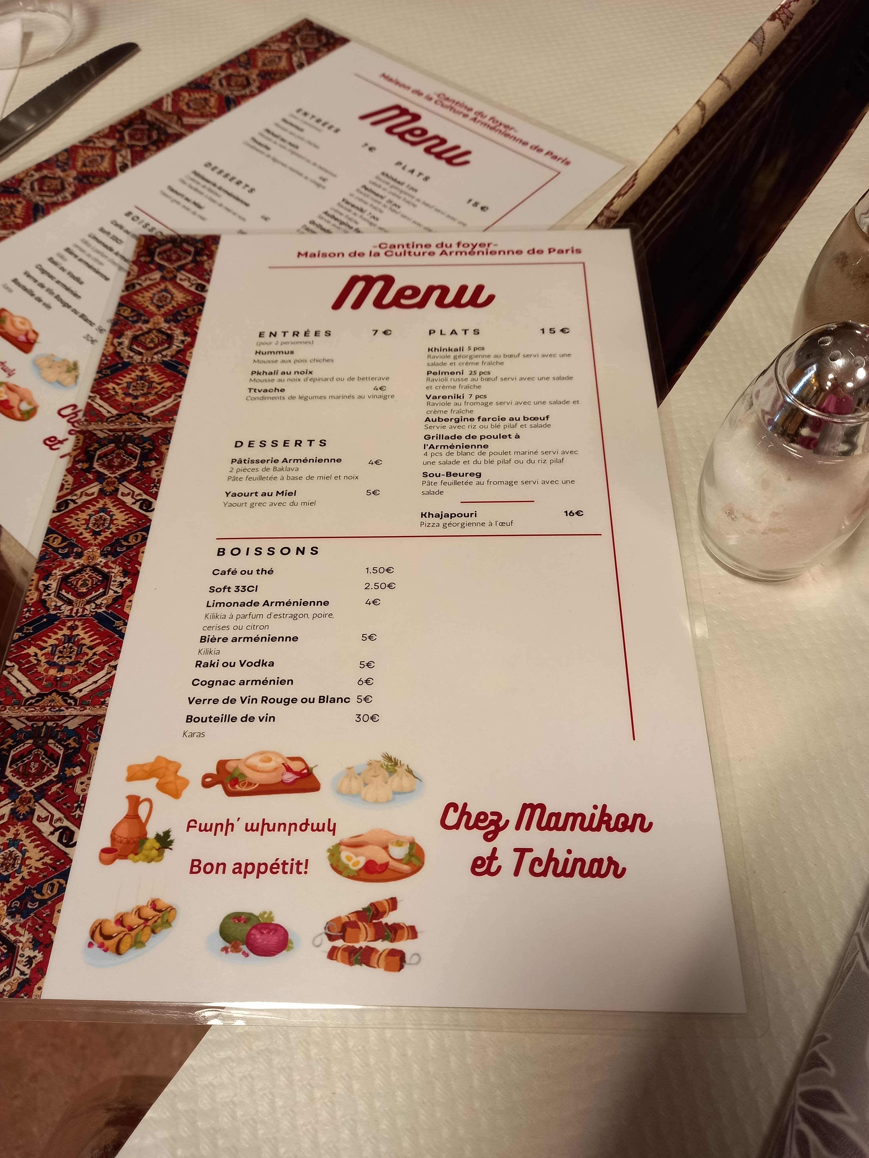 Posté le 21/01/2024 à 12:57"🔵🔵🔵🔵⚪️⚪️ Chez Mamikon et Tchinar l’autre nom de la cantine du foyer arménien, propose avant tout un voyage ! Clairement dans son jus le décorum n’a pas dû bouger depuis plusieurs années. La clientèle assez variée est aussi étonnante que ce lieu. Côté cuisine c’était bon, sans prétention et il ne faut pas avoir de grandes attentes. Nous avons déjeuner de khinkalis, pkhalis, varenikis et dolmas, donc finalement nous n’aurons pas mangé arménien à proprement, curieux que cela ! Cependant il faut tout de même venir essayer l’expérience."
