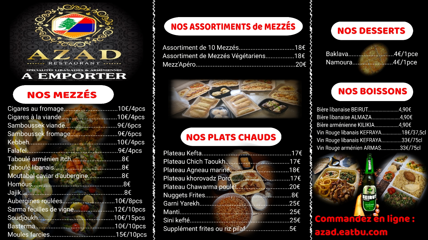 Posté le 14/02/2023 à 20:08"Le restaurant Azad spécialités cuisine Arménienne Libanaise offre en premier un accueil chaleureux depuis le premier jour de son ouverture. Du début jusqu'à la fin du repas le service attentif effectué par la patronne ou un employé est sans faute. Il n y a pas de longue attente et ce moment passé à la table est chaque fois très agréable. Il est possible de commander et de retirer le repas qui vous paraîtra suffisamment copieux. Pour ma part et un prix très raisonnable la St Valentin s est passée comme cela et en plus d une 1/2 bouteille de vin il y avait également une rose pour Madame. Je recommande+++"